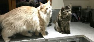 Un nouvel exemple de Maine Coon XXL et de Maine Coon standard avec Pépite ( frère de Perfect providence, par Mogador et Neverland ) Il a 19 mois et son copain Maou chat MC Adulte de 13 ans.