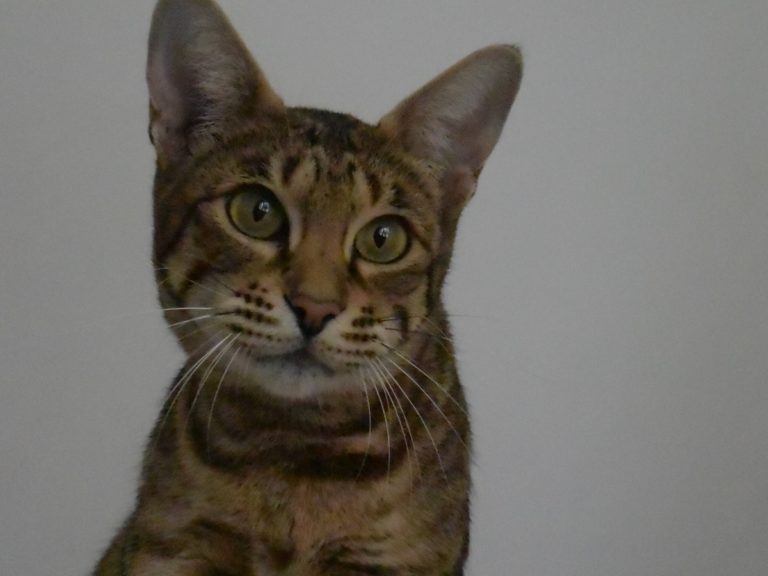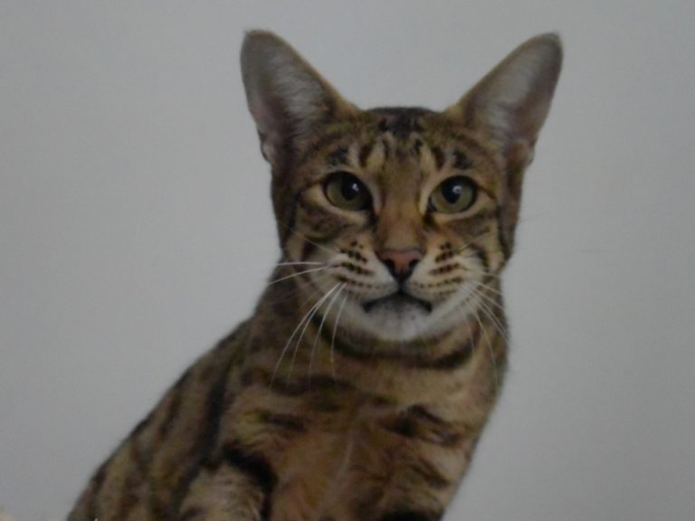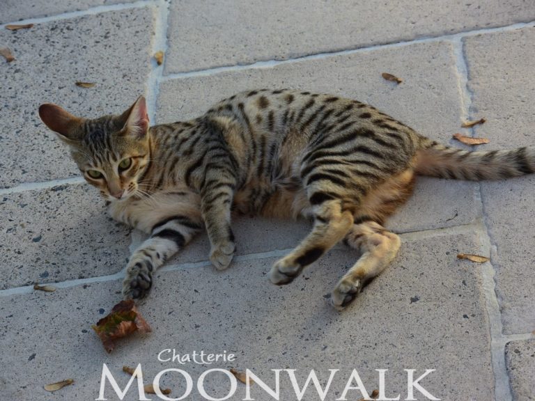 Holà, de père Bahali Kasay et mère Go4wilderness Divine, est née à la Chatterie Moonwalk et a pris le meilleur de chacun des deux parents. Elle est magnifique, très bien typée : grandes oreilles aux ocelles bien visibles, robe contrastée spotts de forme et couleur parfaite. Cerise sur le gâteau, elle a hérité de la queue 3/4 de son père. C'est une femelle discrète et réservée qui viendra vous saluer au moment venu pour faire connaissance. Intelligente et joueuse, elle s'entend bien avec les Maine Coons et les autres Savannahs. Elle n'est pas du tout dominante et demande à être surveillée, car si elle se trouve avec un chat qui la domine, elle perd sa joie de vivre et s'efface pour éviter tout conflit.