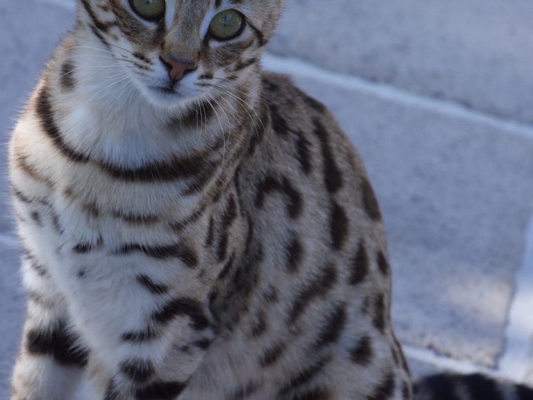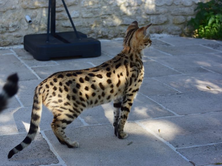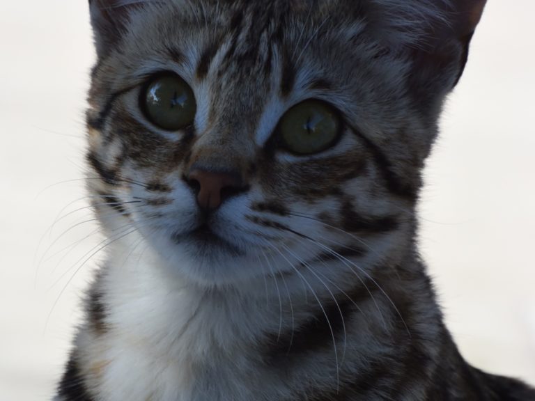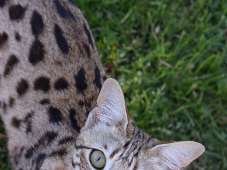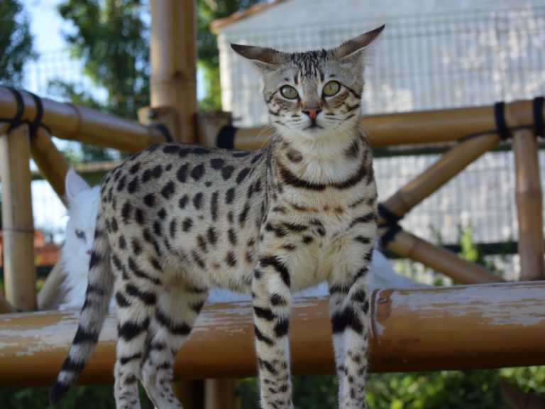 La plus gentille Savannah du monde. Elle nous fait des bisous. Elle monte dans les bras des visiteurs pour un câlin et elle est tellement jolie. Querala est de génération F2.