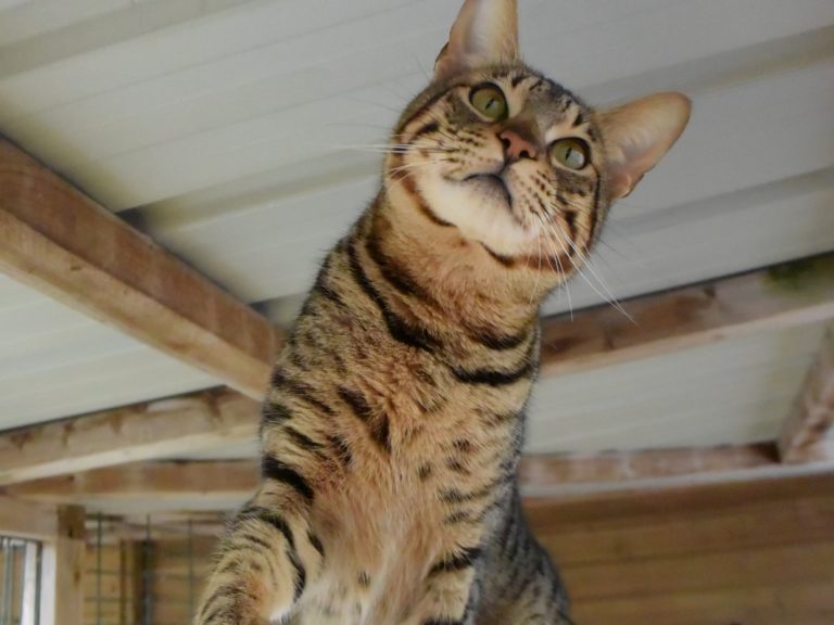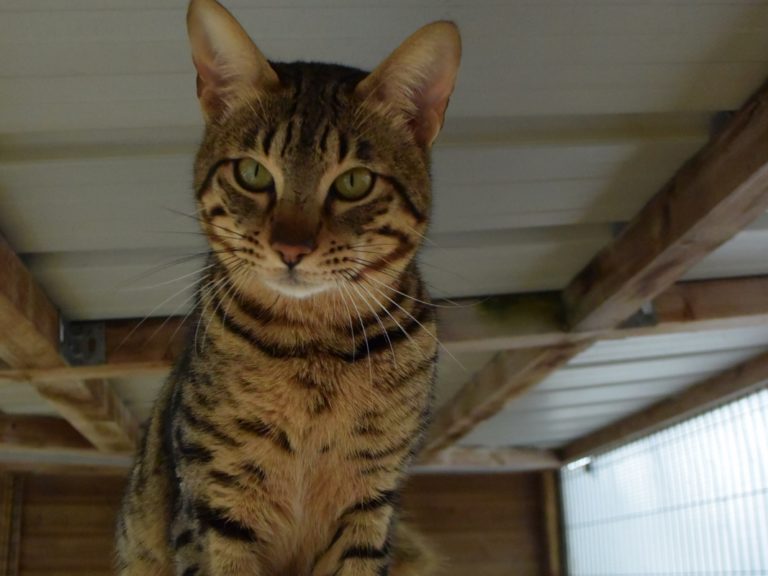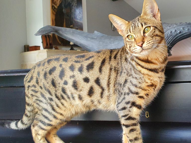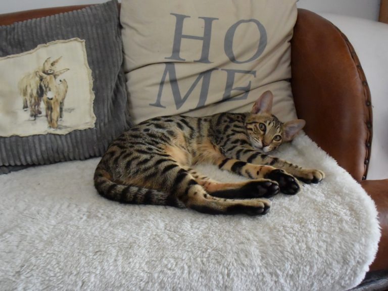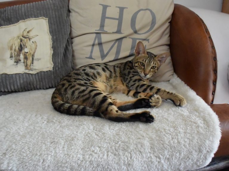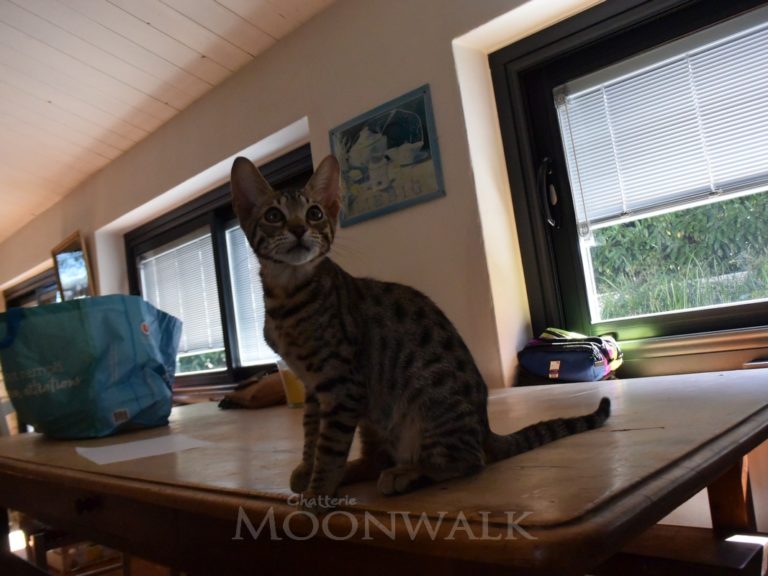 Révolution, un prénom prometteur pour ce mâle Fertile digne fils de Moonwalk Hola qué Tal. Sa mère est la plus prometteuse femelle F5 (Savannah domestique) que j'ai rencontré avec Emotion sa demi sœur.. Il est magnifique, très bien typé : bonnes oreilles aux ocelles visibles, robe contrastée spotts de joli forme et couleur. Grace a son père les spotts ont une jolie couleur bien noire. Je suis impatiente de voir sa descendance.
